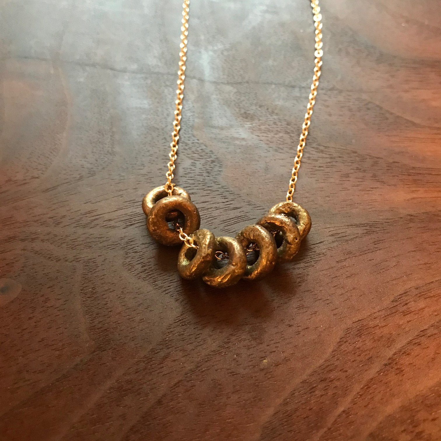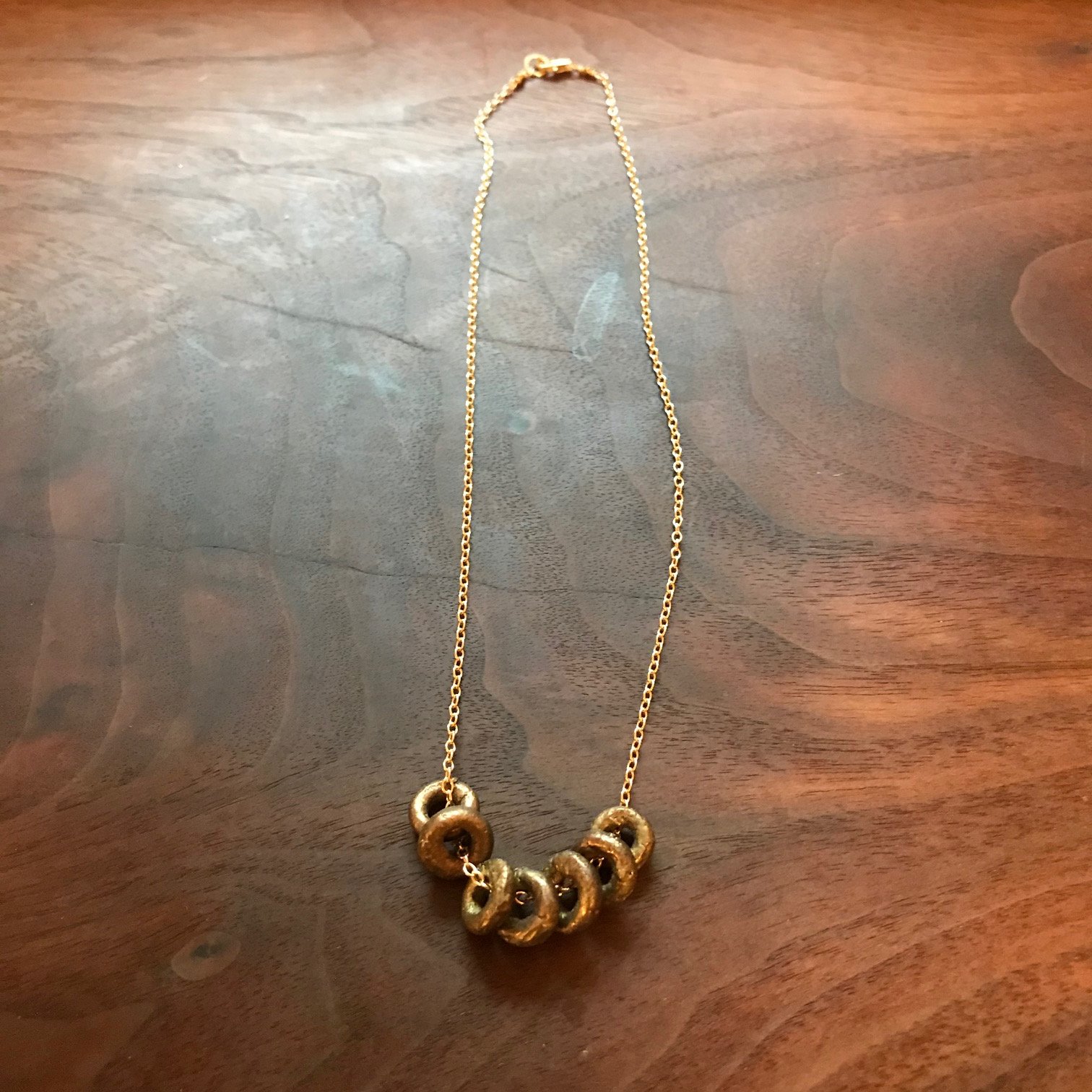 Seven African sandcast bronze circles on a golden chain, hangs just below the collar bone