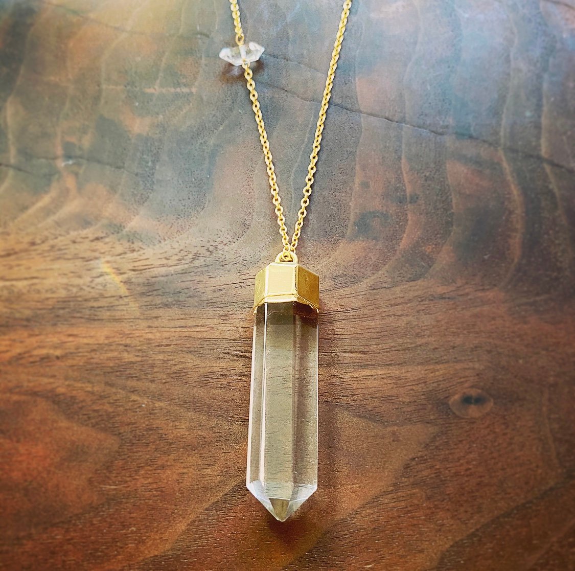 A clear quartz crystal point hangs between solar plexus and heart, bringing clarity and balance. On a golden chain with a small herkimer diamond dancing within. The crystal is prism flashing little rainbows all around you. Each crystal is unique. If you would prefer a more clear or more included stone, please specify.