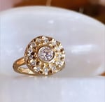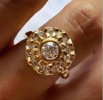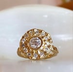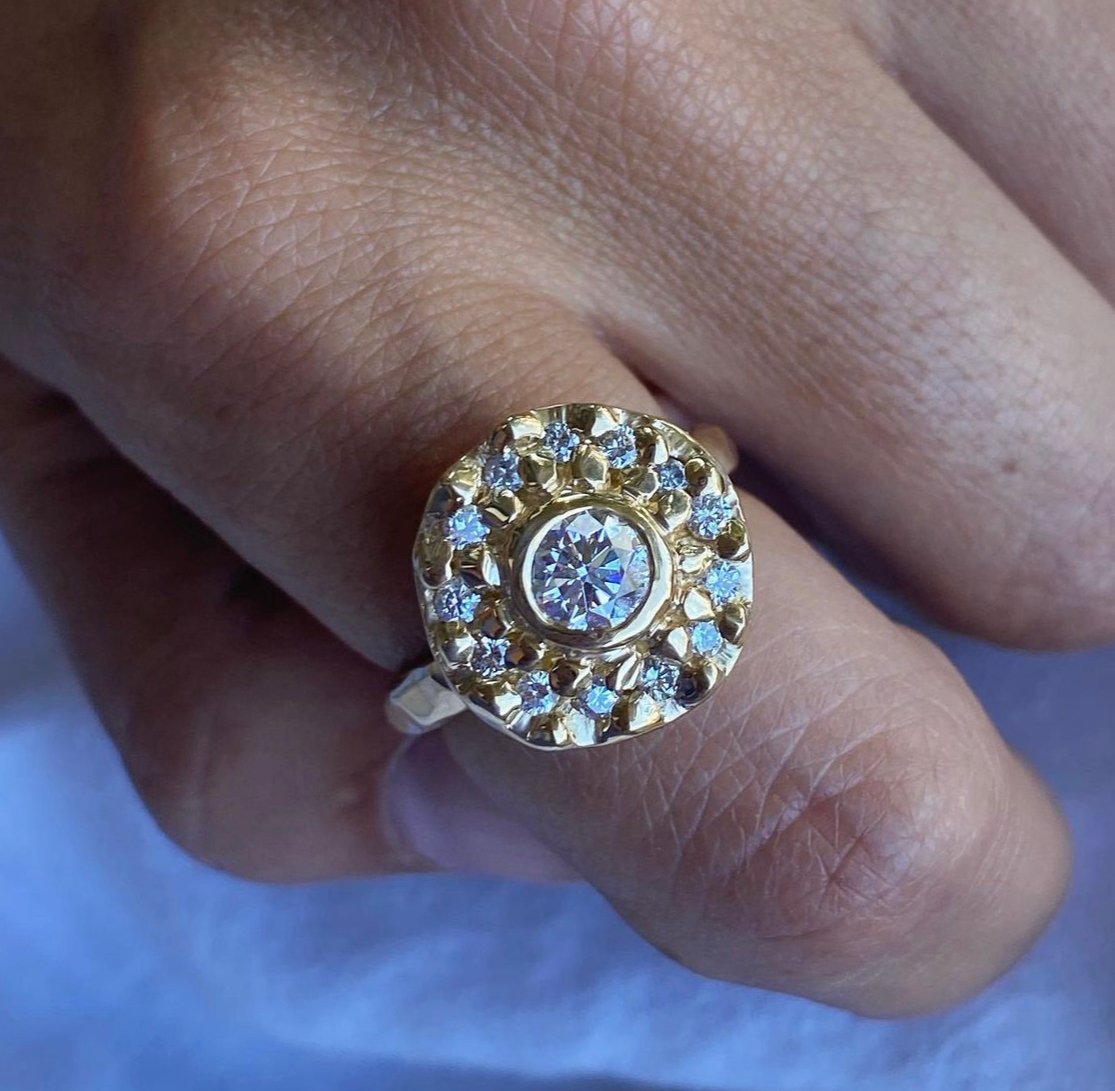 A .75ct certified Harmony diamond, conflict free, brilliant cut surounded by .025ct diamonds and organic gold detailing