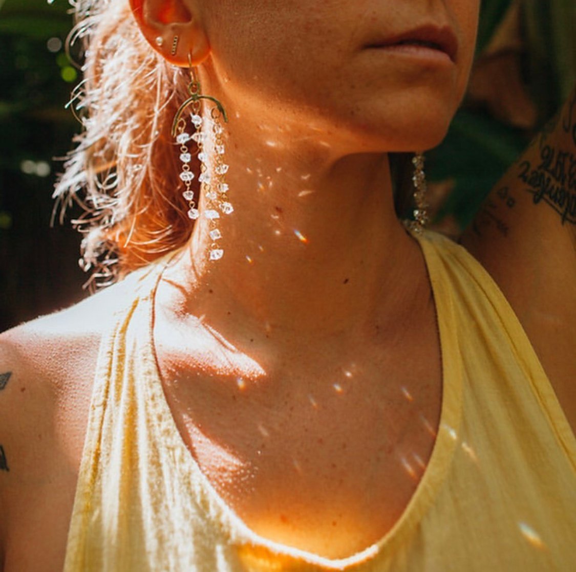 super magical raw earth magic earrings. The herkimer diamonds are raw and transparent with a brilliant sparkle. They manifest pure, solid Light and are powerful amplifiers of spiritual energy. sometimes they shine little rainbows like prisms on your neck