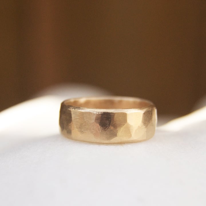 Nice and weighty 14k Gold ring Lovingly handmade with recycled metal Hammered to catch the light