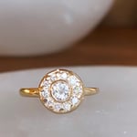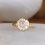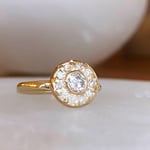 A .5ct diamond, conflict free, brilliant cut surounded by .5ct diamonds and organic gold detailing