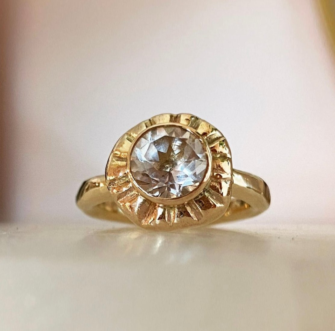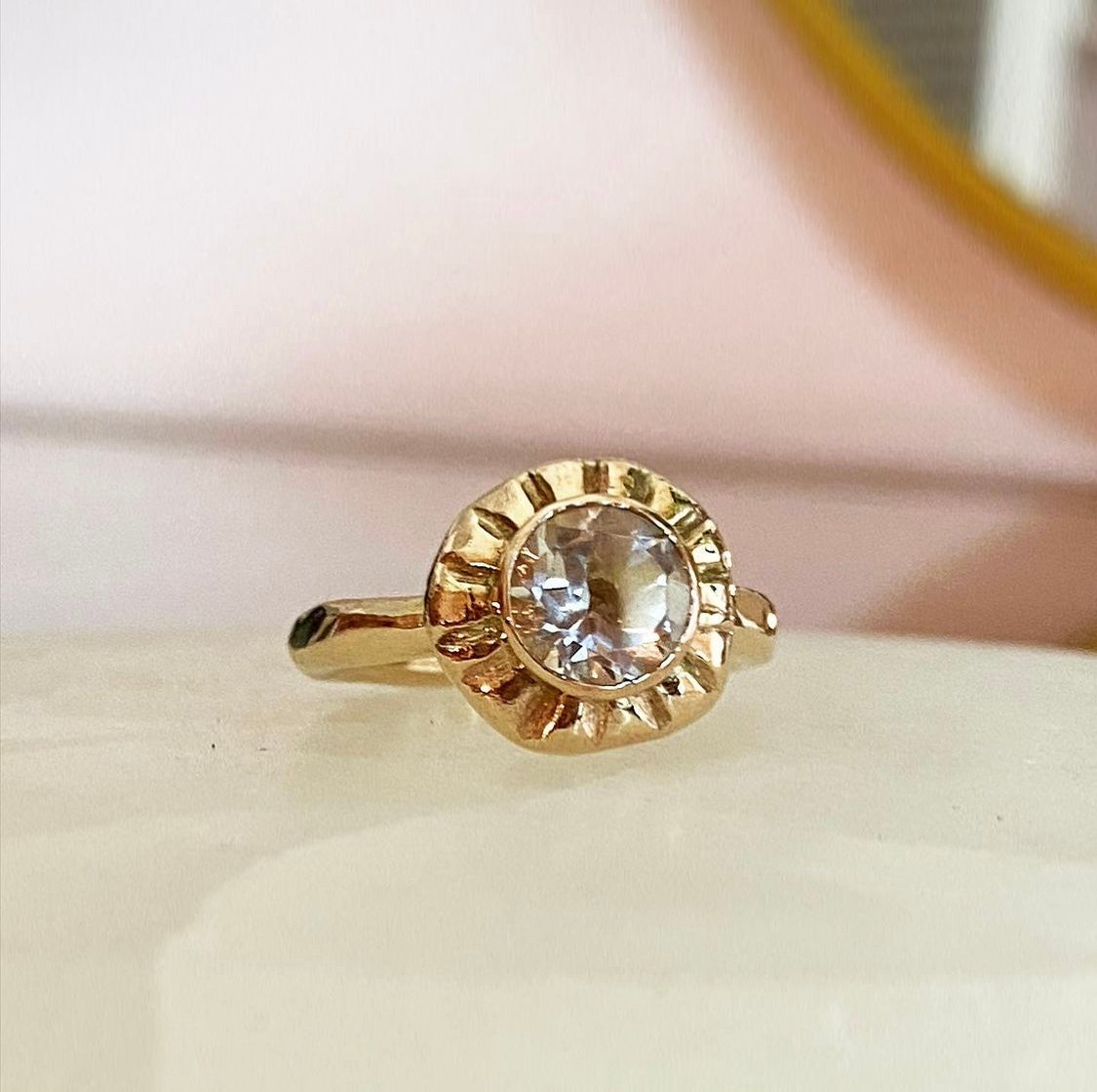 A sparkling white topaz from Brazil set in 14k Yellow Gold shines like the sun